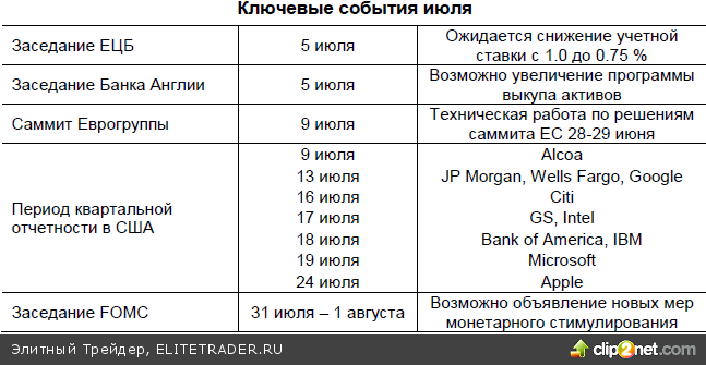 Несмотря на позитивные решения саммита, европейские риски остаются в центре внимания. Наличие этих рисков делает, на наш взгляд, маловероятным полное восстановление стоимости рисковых активов. Мы не думаем, что нынешний рывок вверх – это начало какого-то долгосрочного ралли. Хотя ближайшие события могут поддержать этот рост, и в целом июль может оказаться неплохим месяцем для рынков.