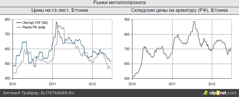 В сегменте сортового проката, который в летние месяцы практически полностью отгружается на внутренний рынок, негативный тренд уже переломлен. Похоже, что строительный сезон в России в этом году начался с некоторым опозданием из-за погодных факторов, однако проходит весьма активно. Рублевые цены на арматуру за последний месяц выросли более чем на 5% и продолжают неуклонно повышаться. Дороже чем сейчас в рублевом выражении за последние годы арматура стоила лишь в течение четырех летне-осенних месяцев прошлого года. Наблюдаемая конъюнктура должна поддержать финансовые результаты таких компаний как Evraz и Мечел