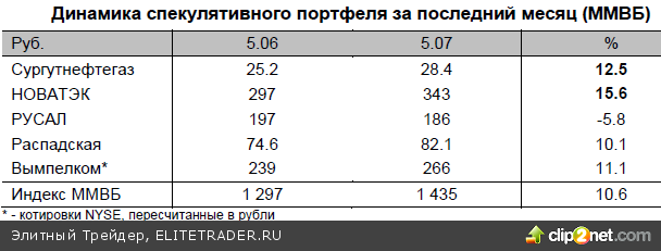 · В спекулятивном портфеле мы заменяем акции РУСАЛа на акции Мечела, исключаем Вымпелком и добавляем МРСК-Холдинг и ФСК ЕЭС. Спекулятивный портфель выглядит следующим образом: Сургутнефтегаз, НОВАТЭК, Мечел, ФСК ЕЭС, МРСК-Холдинг.