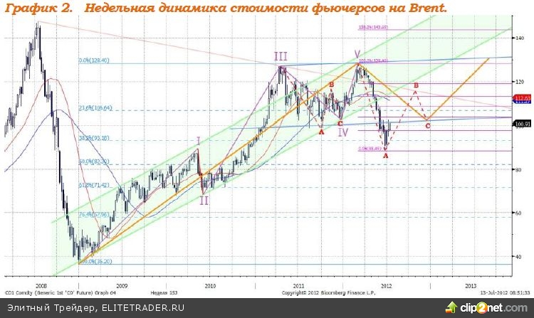 В среднесрочной перспективе, смягчение кредитно-денежной политики, которое предприняли ЕЦБ и НБК поддержит цены на нефть. Во второй половине марта текущего года было завершено формирование фазы роста, которая началась с первых дней 2009 года. В настоящее время формируется плоская коррекция, как следует из графика 2. Минимальная точка коррекции уже достигнута. Ждем роста котировок Brent к отметке $115.