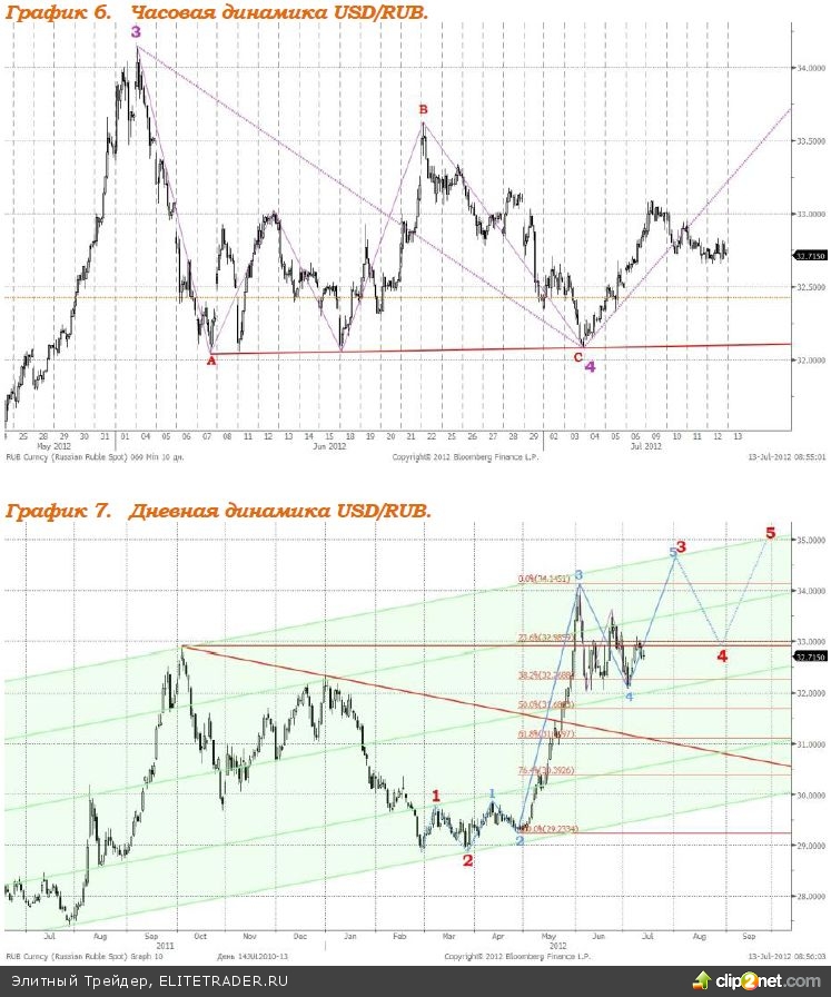 Нефть дорожает, что окажет поддержку рублю, который продолжит сегодня умеренно укрепляться. В течение последних трех дней значение валютной пары доллар/рубль умеренно снижается. Формируется коррекция после импульса роста (график 6). В ближайшие дни увеличение соотношения доллара и российской валюты может возобновиться. Сегодня российская валюта укрепится к доллару до уровня 32,60 рубля за $1. Соотношение евро и российской валюты снизится к отметке 39,80 рубля за €1. Предполагаемая структура динамики соотношения доллара США и российской валюты в среднесрочной перспективе изображена на графике 7.