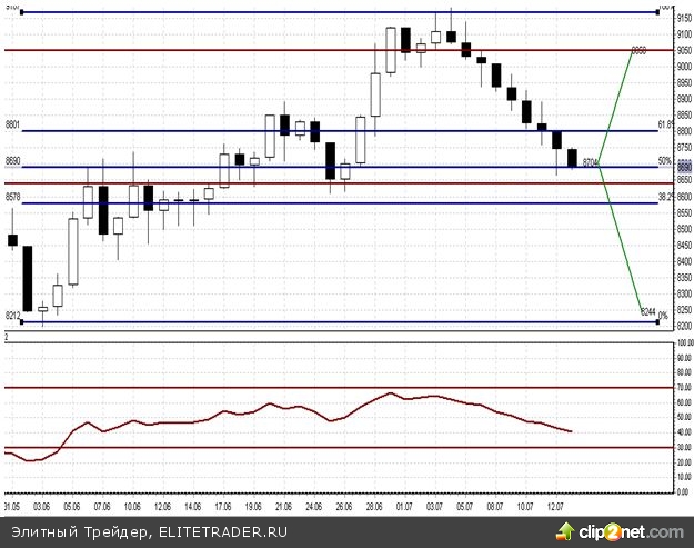 Основная рекомендация: в случае пробития вниз данного уровня, следует открывать короткие позиции в диапазоне 8 500-8 550 с целью 8 200. Стоп-лосс выставить выше уровня 8 700.