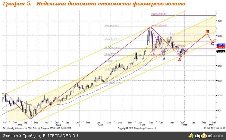 В долгосрочной перспективе продолжает сохраняться высокий уровень рисков, который стал причиной прекращения падения котировок золота на фоне падения на рынках. Драгоценный металл стал выполнять функцию защитного актива, что может дать значительный импульс роста. Кроме того смягчение кредитно-денежной политики со стороны Европы и Китая, а также растущий спрос на золото Центробанка Индии также окажут существенную поддержку котировкам. В настоящий момент формируется волна роста «В» в рамках «плоской коррекции» А-В-С. Предполагаемая динамика развития ситуации изображена на графике 7, ориентиром повышения котировок золота служит уровень $1800