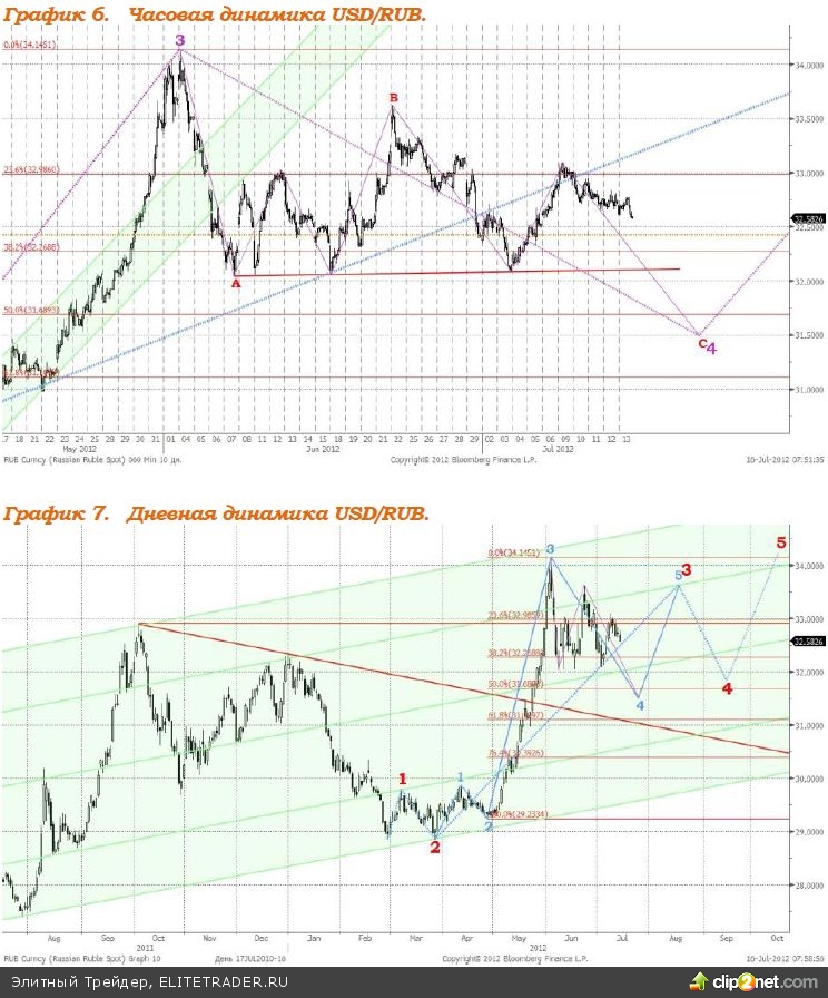 В валютной паре доллар/рубль продолжает формироваться коррекция «А-В-С», направленная вниз. В настоящий момент развивается волна «С», целью которой служит уровень 31,50 рубля. Полагаем, рубль будет сегодня стабилен, торговаться в пределах 32,50 - 32,60 рубля за $1. Соотношение евро и российской валюты будет на уровне 39,85 - 39,90 рубля за €1. Предполагаемая структура динамики соотношения доллара США и российской валюты в среднесрочной перспективе изображена на графиках 6 и 7.