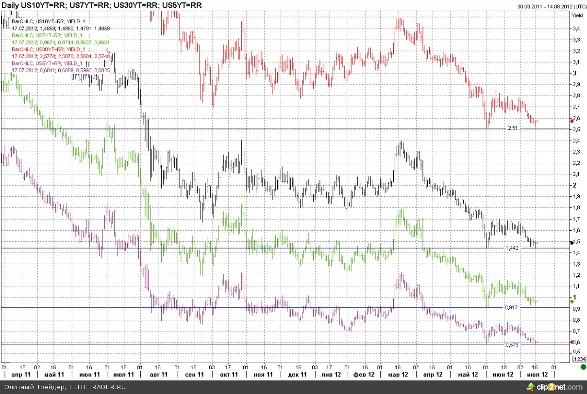 Между тем, общий фон, несущий опасность для рисковых активов, по-прежнему создается долговым кризисом в Европе, что напротив позитивно сказывается на рынке американского госдолга. Затягивающаяся до сентября ситуация с ратификацией ESM в Германии, в том числе отразилась на доходностях американских трежерис. В частности доходность 10-летних нот, вчера опустилась к историческому минимуму на 1,442%. Бумаги с погашением через пять лет и вовсе обновили рекордные минимумы по доходности, которая снизилась до 0,579%.