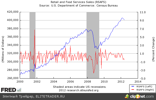 Как сообщило U.S. Census Bureau, объем продаж снижается с максимумов третий месяц подряд, составив в июне $401,515 млрд. В месячном выражении падение составило 0,5%, тогда как аналитики ожидали увеличения показателя на 0,2%. Общий объем продаж за период с апреля по июнь 2012 был выше на 4,7% чем за тот же период прошлого года. Наибольшие потери в денежном выражении объемов продаж понесли продавцы книг/музыкальной продукции (-1,6%) и строительных материалов (-1,6%), а также автозаправочные станции (-1,8%). Потери последних связаны со снижением цен на бензин.