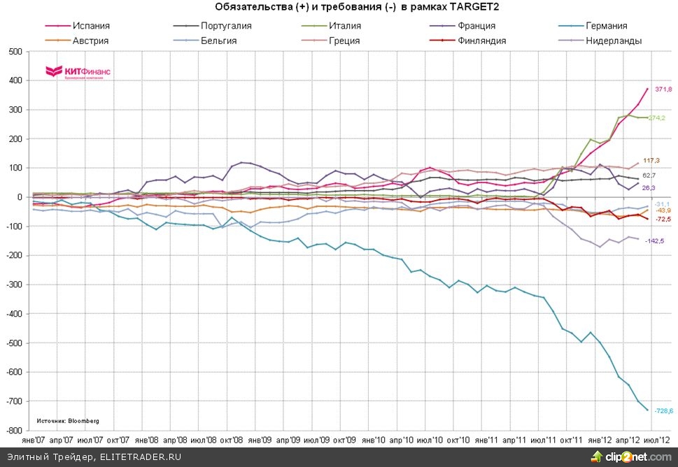 P.S. 17 июля стало известно, что Испания и Финляндия договорились о сумме обеспечения, которое получит Финляндия в обмен на согласие в предоставлении финансовой поддержки испанским банкам. Финляндия стала единственной страной Еврозоны, получившей такие гарантии. Аналогичная схема применялась при одобрении Финляндией финансовой поддержки Греции. Почему? Ответ лежит на поверхности. Требования Финляндии в рамках TARGET2 составляют 33% её ВВП за 2011 г. - максимальный показатель среди европейских стран-кредиторов.