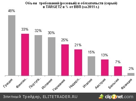 В июне 2011 г., обязательства Италии в европейской межбанковской системе были на уровне €6 млрд. – в мае 2012 г. эта цифра выросла до €274 млрд. (увеличение в 45 раз). Обязательства Испании летом прошлого года колебались возле отметки в €50 млрд., а в июне текущего года составили 371 млрд. (увеличение в 7,5 раз). Требования главного европейского кредитора – Германии – в июне 2011 г. составляли €336,5 млрд., и за год выросли более чем в два раза. Крупнейшими должниками в % отношении к ВВП в рамках TARGET2 являются Греция и Ирландия.