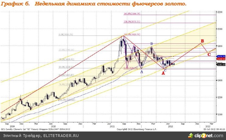 В настоящий момент формируется волна роста «В» в рамках «плоской коррекции» А-В-С. Предполагаемая динамика развития ситуации изображена на графике 6, ориентиром повышения котировок золота служит уровень $1800.