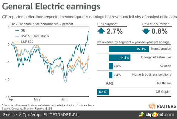 Компания, представляющая различные сектора американского бизнеса, и результаты которой считают представительными в качестве определенного среза экономики США - General electric сообщила о сокращении чистой прибыли на 15,8% до $3,11 млрд или 29 центов на акцию с $3,69 млрд или 35 центов на акцию годом ранее. В то же время операционная прибыль составила $4 млрд, или 38 центов на акцию. Аналитики ожидали прибыли на уровне 37 центов на акцию. Выручка за отчетный период выросла на 2,5% с $35,623 млрд до $36,501 млрд, но не дотянула до прогнозных $36,8 млрд. По словам финансового директора корпорации Кейт Шерин, промышленные продажи группы в Европе снизились на 7%, тогда как на 6% наблюдался рост в США и на 24% продажи выросли в Китае.