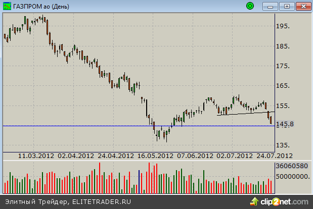 Акции "Газпрома" рассмотрим подробнее. Ниже представлен дневной график котировок по состоянию на закрытие 24 июля.