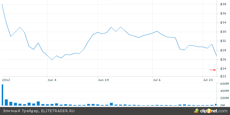 Скорректированная прибыль без учета разовых затрат составила 12 центов на акцию, что совпало с прогнозами аналитиков, однако котировки акций FB на постмаркете все же провались к рекордным после размещения минимумам ниже $24 за акцию, потеряв более 10%. Подобная реакция последовала ввиду того, что компания предпочла не давать прогноз на текущий квартал.