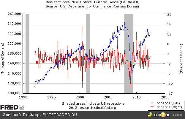 По данным U.S. Census Bureau объем заказов на товары длительного пользования в июне не сбавил темпов роста по сравнению с предыдущим месяцем, прибавив 1,6%, тогда как консенсус прогноз предполагал рост всего на 0,4%. В абсолютном выражении рост составил $3,4 млрд до $ 221,626 млрд. Существенный рост показали заказы на гражданские самолеты и на военное оборудование. В то же время заказы без учета транспортного оборудования снизились в июне на 1,1%, что стало максимальным падением за пять месяцев.