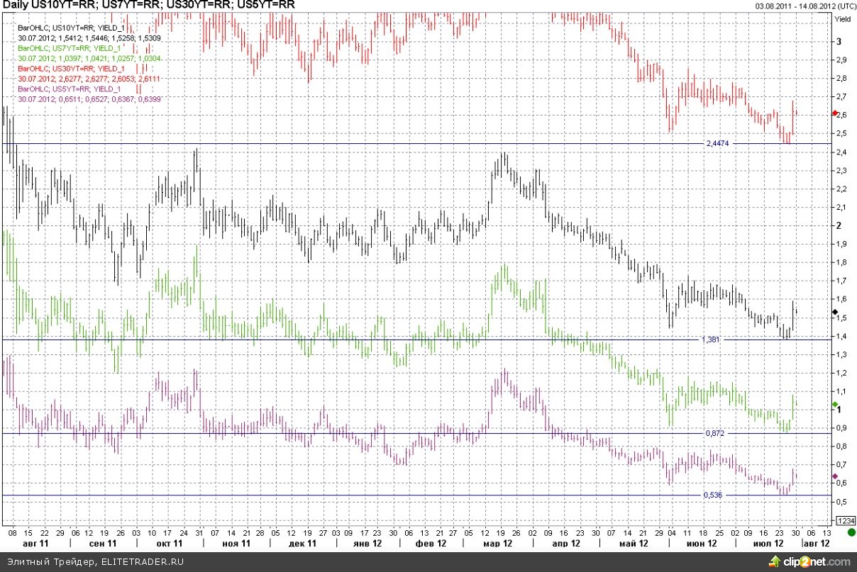 Крайне эмоционально на пятничные события отреагировал рынок американского госдолга. Доходность среднесрочных и долгосрочных трежерис резко поднялась от уровней исторических максимумов. Причиной этому могли стать как ожидания новой программы выкупа от ФРС, так и стабилизация ситуации в бондах европейских стран.