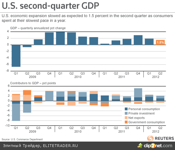 За океаном, тем временем были опубликованы данные относительно первой оценки динамики американского ВВП во втором квартале 2012 года. BEA обозначила цифру в квартальном исчислении на уровне 1,5% до $13,558 трлн, что совпало с консенсус прогнозом Reuters и превысило средний прогноз аналитиков опрошенных Bloomberg, предполагавший рост на 1,4%. И все же, темпы роста ВВП снижаются второй квартал подряд, что подстегивает в спекулянтах ожидания введения QE3 со стороны ФРС на ближайшем заседании, которое стартует завтра и продлится два дня. Разрыв стал больше по сравнению с прошлым кварталом ввиду пересмотра значения за январь-март 2012 года с 1,9% до 2%.