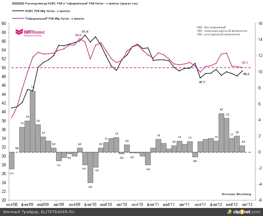 Дивергенция между двумя оценками деловой активности достигла пика в 4,8 пункта в марте 2012 г. Далее спрэд начал сокращаться в пользу снижения “официального” PMI (см. рисунок ниже).