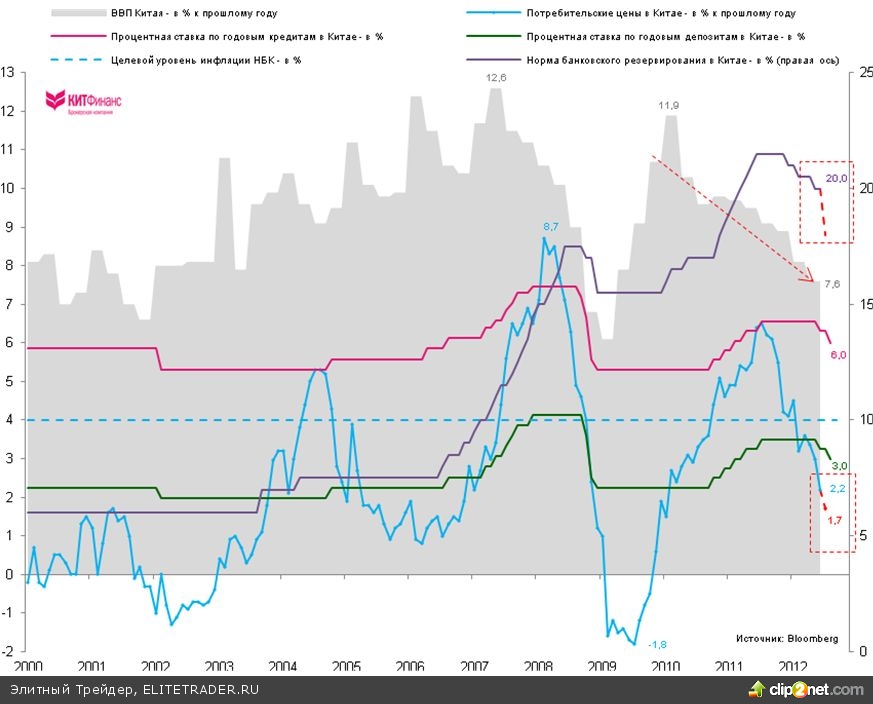 С июня 2012 г. Народный Банк Китая уже два раза пошел на понижение ключевых процентных ставок по годовым депозитам и кредитам.