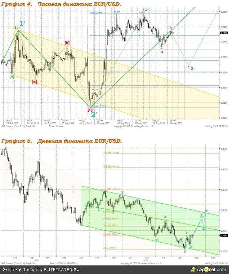 Закончив вчера формировать локальную фазу роста (волну -b-) валютная пара евро/доллар начнет формировать движение вниз, волну -c- в волне -2-. Окончание волны -2- предполагаем вблизи значения 1,2270. Предполагаемая структура движения котировок евро/доллара изображена на графиках 4 и 5.