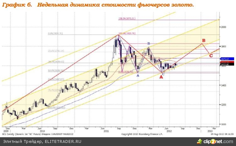 В настоящий момент формируется волна роста «В» в рамках «плоской коррекции» А-В-С. Предполагаемая динамика развития ситуации изображена на графике 6, ориентиром повышения котировок золота служит уровень $1800