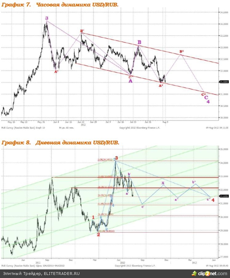 Валютная пара доллар/рубль, на наш взгляд, вчера закончила формировать нисходящую волну A* волны C, см график 7, достигнув поддержки (нижняя красная линия на графике 7). Полагаем, в ходе сегодняшних торгов российская валюта ослабнет и достигнет отметки 31,75 к доллару. Предполагаемая структура динамики соотношения доллара США и российской валюты в среднесрочной перспективе изображена на графиках 7 и 8.