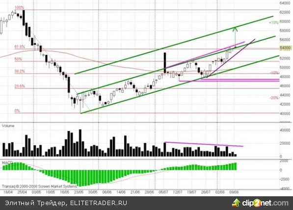 Для тех, кто смотрит на рынок менее глобально, при позитивном развитии сценария, сопротивление, на которое стоит обратить внимание - уровень 59000 (проекция указанного ранее канала). А "стоп-лосс" заложить под краткосрочный тренд от июля 2012 года - 53000 рублей. Это не просто тренд, его пробитие может подтвердить силу едва пока заметной дивергенции между ценой и объемом.