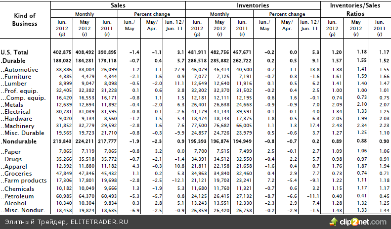 Между тем, как сообщило Census Bureau оптовые запасы в июне сократились на 0,2% (ожидался рост на 0,4%) до $481,9 млрд., при этом майское значение было пересмотрено с 0,3% до 0%. Наиболее существенно сокращение отмечено по нефти и нефтепродуктам на 8,7%. Оптовые продажи и вовсе сокращаются второй месяц подряд, потеряв в мае 1,1%, и 1,4% в июне.