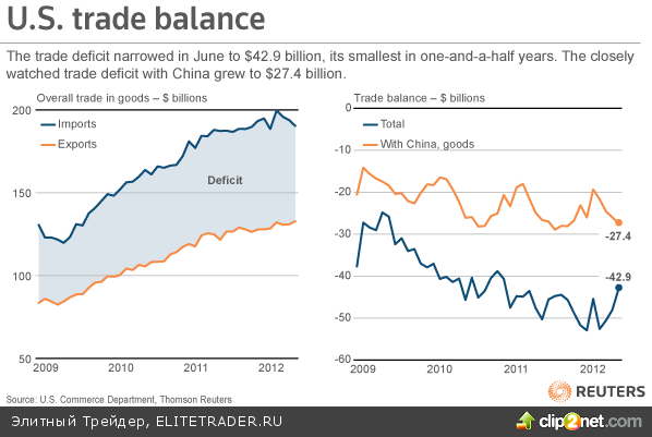 Данные BEA по торговому балансу за июнь показали, что его дефицит снизился до минимумов с декабря 2010 года, с пересмотренных $48 млрд. до $42,9 млрд. Таким образом, эти цифры внесут свой позитивный вклад в пересмотренную оценку по динамике ВВП за II квартал 2012 года, но нужен ли подобный позитив в ожидании QE3? Совокупный экспорт в июне составил $185 млрд., импорт $227,9 млрд. В мае-июне рост экспорта товаров отражает рост в секторах: потребительских товаров ($ 0,9 млрд.); автомобильной техники, запчастей ($0,7 млрд.), промышленных товаров и материалов ($0,6 млрд.) Снижение зафиксировано в продуктах питания, кормов и напитков ($0,8 млрд.). Снижение импорта главным образом обусловлено снижением в объем импортируемого сырья, и в большей степени сырой нефти на $2,653 млрд.