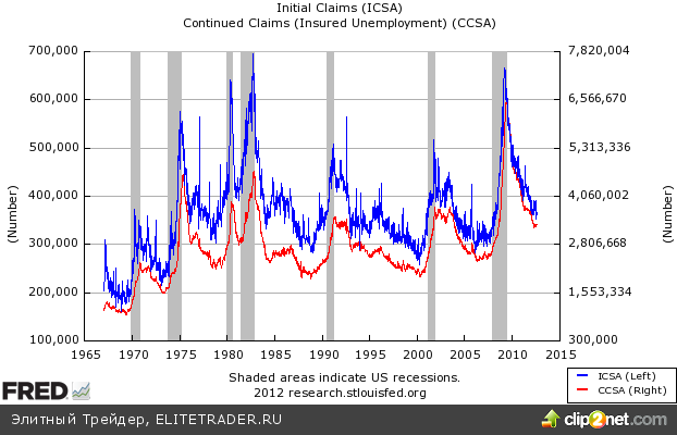 Статистика, выходившая вчера, и которая будет публиковаться в ближайшие недели ввиду ожиданий монетарных стимулов имеет неоднозначную трактовку и соответственно меньше влияния на рынки, хотя ее ухудшение скорее толкуется в пользу новых послаблений со стороны ФРС. Обнародованные в четверг цифры по первичным обращениям за получением пособий по безработице показали, что за неделю количество обращений снизилось до 361 тыс., по сравнению с пересмотренными 367 тыс. неделей ранее. Аналитики ожидали 370 тыс. Общее количество претендующих на выплаты по всем программам страхования в период 14 - 21 июля снизилось с 5,964 млн. до 5,75 млн. Самый высокий уровень безработицы среди застрахованных на 21 июля зафиксирован в Пуэрто-Рико (4,3%), на Виргинских островах (4,1%) и Нью-Джерси (3,8%). Наибольший рост первичных заявок за неделю, завершившуюся 28 июля был отмечен в Нью-Йорке (+3250) и Вашингтоне (+485).