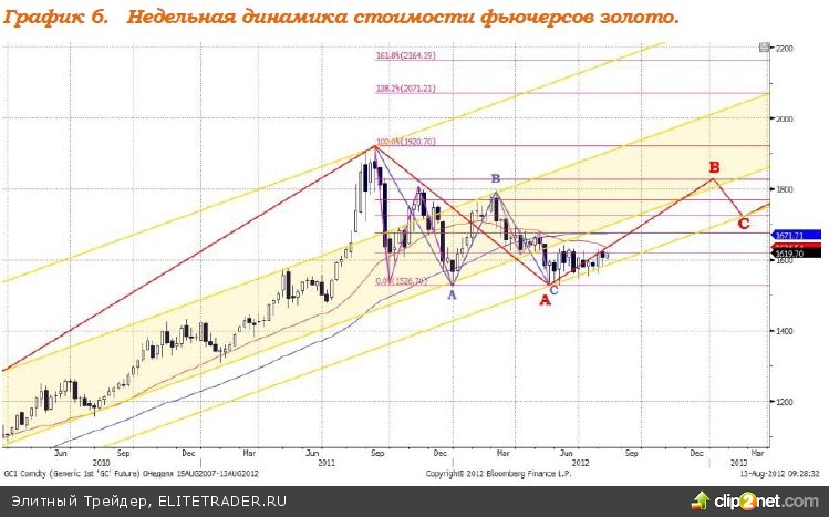 В настоящий момент формируется волна роста «В» в рамках «плоской коррекции» А-В-С. Предполагаемая динамика развития ситуации изображена на графике 6, ориентиром повышения котировок золота служит уровень $1800.