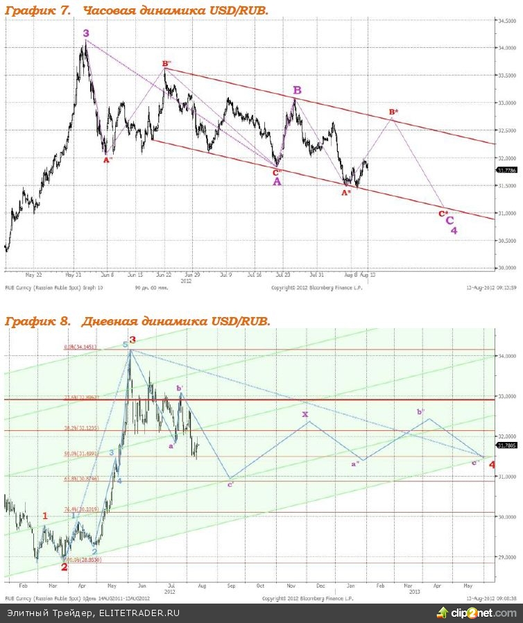 Валютная пара доллар/рубль начала формировать волну В* волны C, см график 7, достигнув поддержки - нижней красной линии. Полагаем, в ходе сегодняшних торгов российская валюта укрепиться до уровня 31,60 - 31,70 к доллару. Предполагаемая структура динамики соотношения доллара США и российской валюты в среднесрочной перспективе изображена на графиках 7 и 8