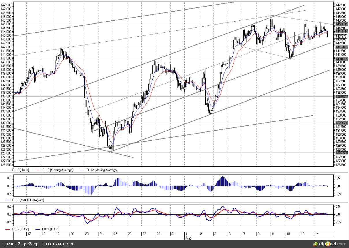 Ближайшая внутритрендовая поддержка восходящего канала находится сейчас на 142500. При ее пробитии следующая цель на 140500, а далее уже на 139000. И возможно даже ниже, если «ромб» будет полностью реализовывать свой технический потенциал. Тем более что после хорошей волны роста с конца июля сейчас высока вероятность более серьезного снижения, особенно на фоне возможной коррекции нефтяного рынка.