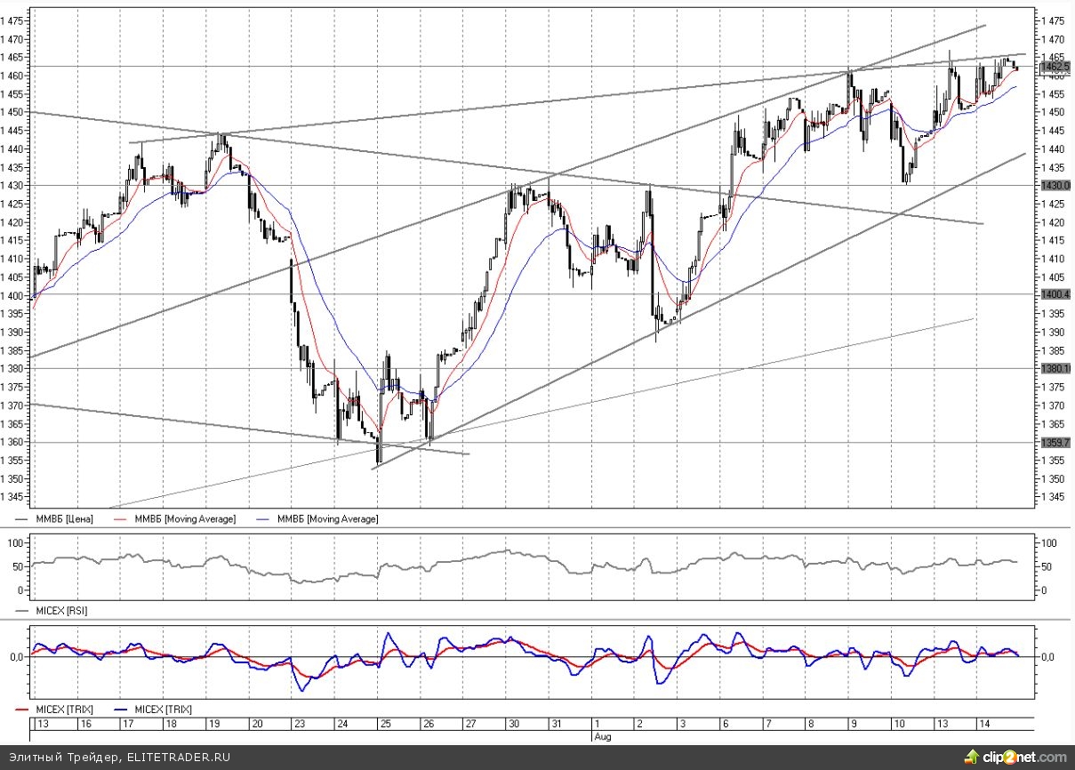 После небольшого отката назад индекс ММВБ снова направился вверх в район текущих максимумов на 1465. Но от этих уровней вновь прошел откат назад. Игроки на повышение натыкаются здесь на серьезное сопротивление с середины июля. От него идет снижение.