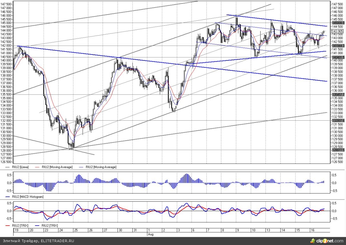 В целом, все эти движения по-прежнему напоминают консолидацию на текущих уровнях в сужающемся треугольнике между 141500 и 144500. Если линия сопротивления на 144500 все же будет пробита, можно будет увидеть заход к августовским максимумам на 146000. Но учитывая перегретость нефтяного рынка и почти неизбежную там коррекцию, больше вероятности на скорое снижение. Ближайшие цели на коррекции - линия поддержки восходящего тренда с конца июля в районе 141000-141500.