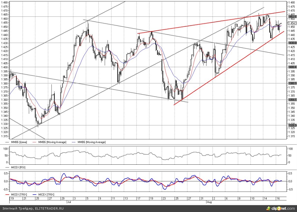 Но после такой волны роста за последние полтора месяца на нефтяном рынке уже созрела коррекция, которая может начаться в любой момент. Это скажется и на нашем рынке, к тому же восходящий клин обычно по технике реализуется вниз. Поэтому после еще одного движения вверх можно будет увидеть новый заход вниз с тестированием восходящего тренда с конца июля на 1445 и, возможно, дальнейшим пробитием.