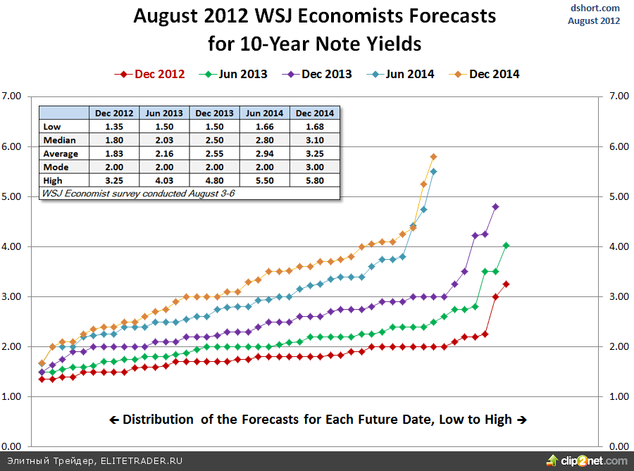 Финансовое издание Wall Street Journal провело исследование, в котором принял участие 51экономист. Респондентам было предложено дать свой долгосрочный прогноз (лето 2012 – декабрь 2014 год) по 10-летним казначейским нотам.