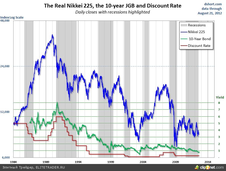 График 3. Динамика: Nikkei 225, 10-летняя JGB и процентная ставка Японии.