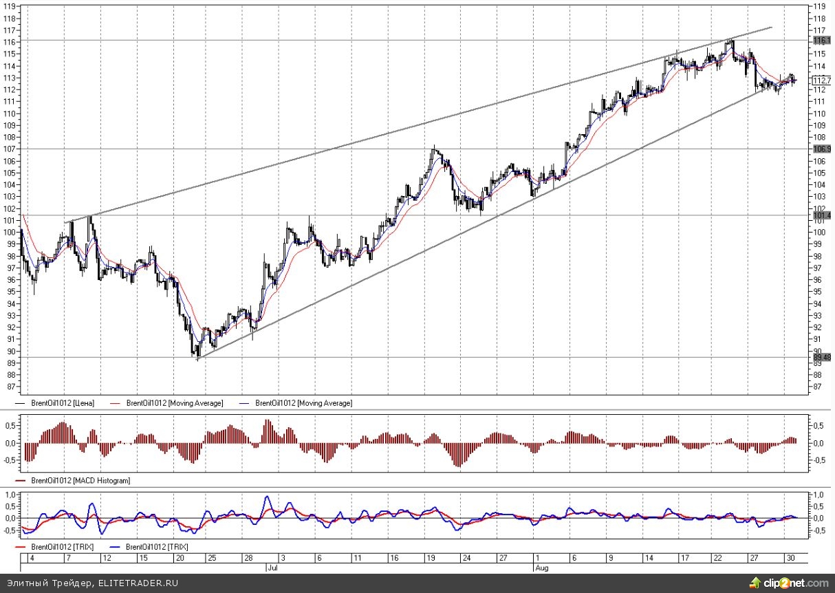 Марка Brent после небольшой волны снижения и попытки пробить свой двухмесячный восходящий тренд с конца июня в районе $112,5 немного отскочила вверх. Цена пока удерживается на линии поддержки, но в ближайшее время, очевидно, будут предприниматься новые попытки пробить этот тренд. Тем более что сейчас цена находится в двухмесячном восходящем клине, а он обычно по технике пробивается вниз. Пробитие восходящего тренда может вызвать дальнейшие продажи и спровоцировать давно уже назревшую коррекцию с откатом к поддержкам на $107 за баррель. Но сегодня с утра нефтяные фьючерсы на Brent стабильны на текущих уровнях около $112,8 за баррель.