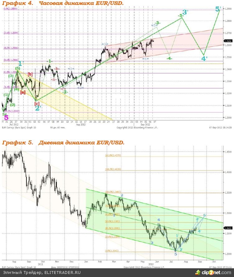 Соотношение единой европейской валюты и доллара в настоящее время продолжает формировать восходящую волну -3-, целью которой видим уровень 1,2770. В настоящий момент пара находится в рамках канала, который обозначен на графике 4 розовым цветом. Значение EUR/USD встретила сопротивление верхнюю границу указанного ценового коридора. Сегодня, на наш взгляд, валютная пара может откатиться к уровню 1,2600, после чего рост соотношения евро и американской валюты может возобновиться, в результате чего может быть преодолена верхняя граница розового канала. Предполагаемая структура движения котировок евро/доллара изображена на графиках 4 и 5.