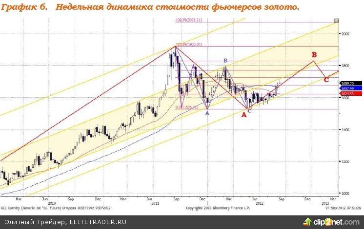 В настоящий момент формируется волна роста «В» в рамках «плоской коррекции» А-В-С. Коррекции предшествовала без малого трехлетняя фаза роста. Вполне логично, что период компенсации роста предположительно будет длиться порядка полутора лет и, по нашим расчетам, завершится в первом квартале 2013 года, после чего начнет формироваться следующая волна подъема котировок. Текущая волна «В» в рамках коррекционного движения направлена вверх, целью, по нашим прикидкам, служит отметка $1830. После чего может последовать волна «С» - цель $1720; на этом «плоская коррекция», по нашему мнению, будет реализована, далее стартует фаза роста.