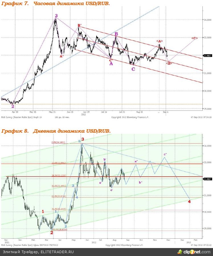 Пара доллар/рубль снижается в рамках волны , см график 7, достигнув ранее сопротивления - верхней красной линии. Целью волны является отметка 31,60. Полагаем, сегодня после вчерашнего бурного укрепления рубль может немного ослабнуть, торги российской валютой стартуют на уровне 32,00. В течение дня соотношение американского доллара и рубля может достигнуть значений 32,10 - 32,15. Предполагаемая структура динамики соотношения доллара США и российской валюты в среднесрочной перспективе изображена на графиках 7 и 8.