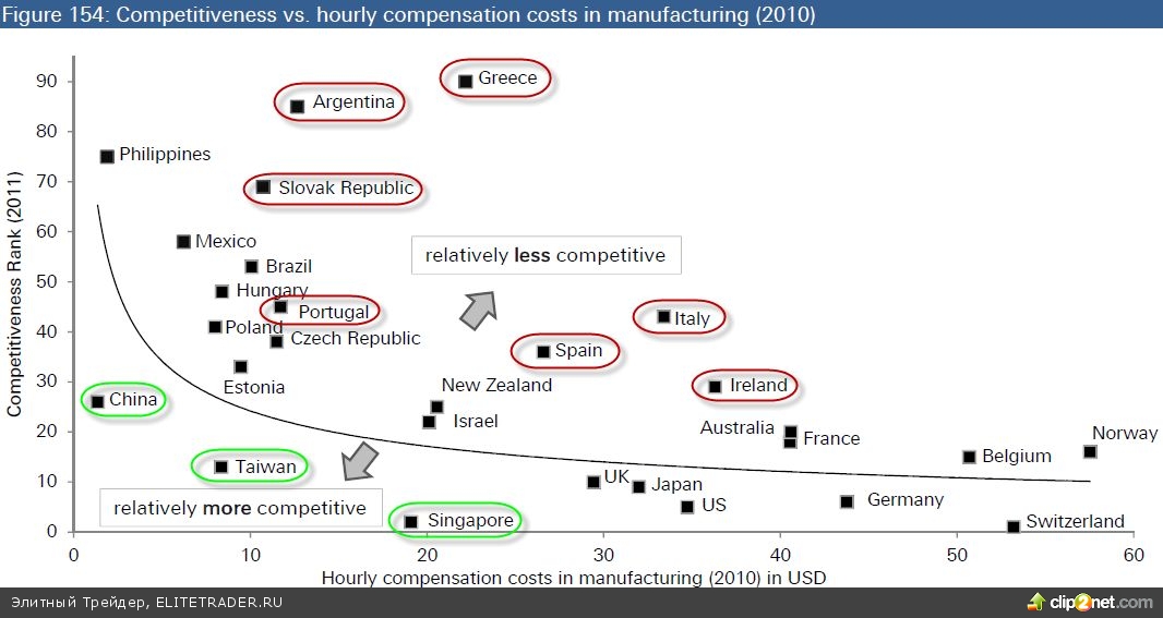 Deutsche Bank предлагает оценить мировую конкурентоспособность стран, исходя из почасовой оплаты труда, действующей в этих странах. Чем более конкурентоспособная страна, тем выше почасовая оплата. Связь между этими двумя значениями абсолютно устойчивая. Страны, находящиеся ниже кривой регрессии (см. график №1), имеют хорошие позиции относительно уровней оплаты труда тогда, как страны, расположенные выше черты регрессии, имеют невысокую конкурентоспособность. Греция – страна с наихудшими показателями. Италия, Испания и Аргентина тоже находятся выше кривой. И этим странам предстоит пройти нелегкий путь перед тем, как они смогут оказаться в одной линейке с более успешными игроками.