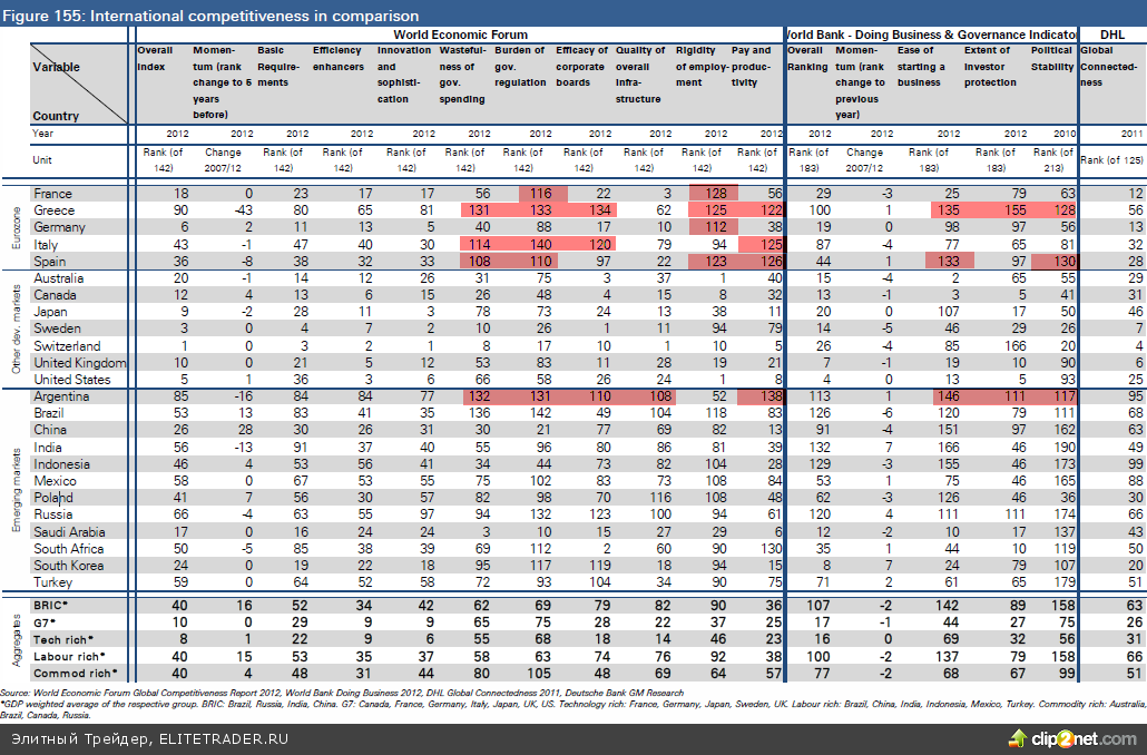 Эти торговые дисбалансы – есть следствие различий в степени конкурентоспособности стран. Согласно отчету Deutsche Bank, инвесторы склонны инвестировать большую часть активов в страны с высокой конкурентоспособностью. Эти инвестиционные деньги, в свою очередь – базовая платформа для развития частного корпоративного сектора этих стран.
