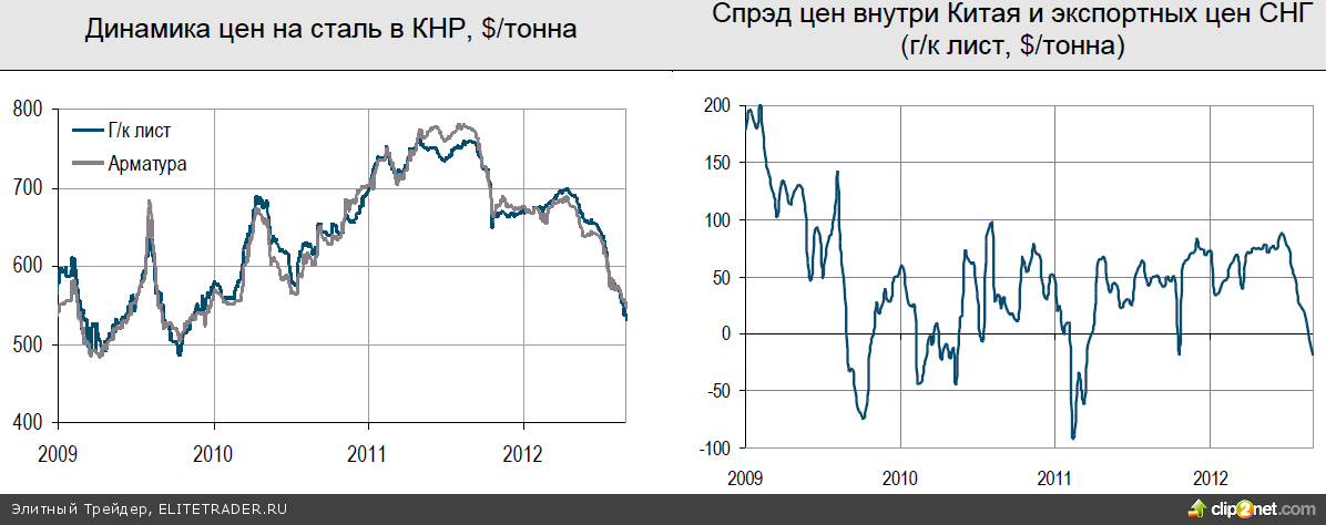 Китайский рынок при этом действительно является главным поводом для беспокойства, которое подкрепляется не только снижением котировок железной руды, но и неуклонным падением внутренних цен на сталь в самом Китае. Исходя их доступных данных за январь-июль, внутреннее потребление металлопроката в Китае в последние месяцы росло с темпами в 5-10% г/г, однако, судя по динамике цен, в августе- сентябре можно ожидать более скромных цифр. В этих условиях, китайские производители стали могут столкнуться с очевидным выбором: сокращать производство (что пагубно отразится на мировом рынке сырья) или увеличивать экспорт (наводнив новой продукцией мировой рынок стали). Вероятнее всего, в том или ином виде на первоначальном этапе будут реализованы оба этих сценария, однако с сильным перекосом в сторону первого: существенному увеличению экспорта со стороны китайских производителей мешает неблагоприятный налоговый режим, непростая логистика и, зачастую, качественные характеристики металла. Кроме того, экономически стимулов для роста поставок не так уж и много: сейчас цены в Китае ниже мировых лишь на $15-25 за тонну, подобный же спрэд наблюдался в течение 2-3 месяцев в каждом из последних 3 лет и не приводил к серьезным изменениям на рынке