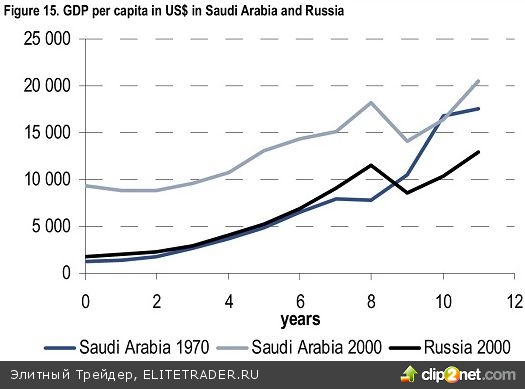 Любопытное сравнение увеличения ВВП в Саудовской Аравии в 1970 году и ВВП России за последние 10 лет вызывает беспокойство у аналитиков. Рост экономики в обеих странах явно привязан к стоимости нефти. А если так, то скоро Россию настигнет нефтяное проклятие” и до следующего цикла повышения стоимости нефти нам не видать опережающего роста экономики