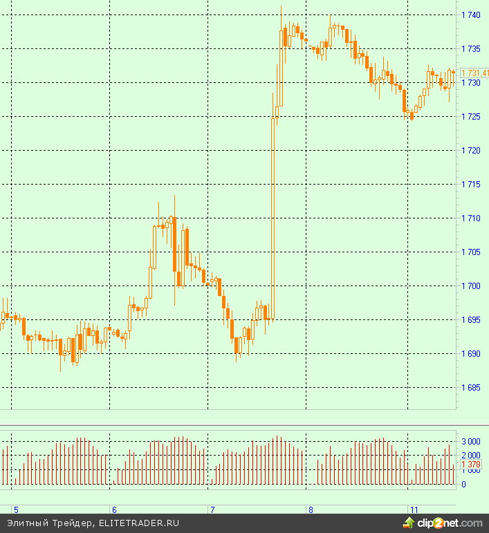 После достижения отметки в $1740, золото немного скорректировалось до $1725, однако сегодня утром вновь было откуплено до $1730. При этом уровень $1725 может выступать в качестве локальной поддержки.