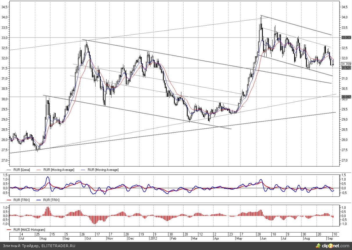 С технической стороны пара рубль-доллар продолжает движение в границах трехмесячного нисходящего канала с начала июня, сейчас держится недалеко от минимумов начала августа на 31,4-31,5, которые вскоре вероятно будут протестированы. Более того, если позитив на мировых рынках сохранится, то возможно и движение к нижней границе этого трехмесячного down-тренда в район 31,0.