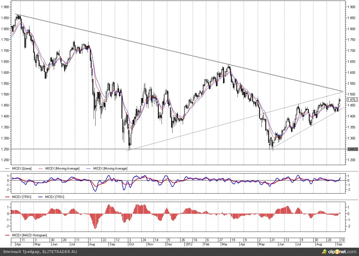 С точки зрения техники, боковое движение в последнее время изрядно затянулось, поводов для роста не было, а продавать или шортить по-крупному инвесторы не спешили, опасаясь объявления в любой момент новых стимулов. Технически наш рынок в ближайшее время имеет практически равные шансы на движения в обе стороны. Последние год-полтора индекс ММВБ находится в широком сужающемся треугольнике с линией сопротивления на 1500 и уровнем поддержки на 1250. Высока вероятность, что рынок вскоре попытается выйти из эитх границ. Но здесь есть два варианта: если стимулирующие меры мировых регуляторов начнут активно работать - увидим новую волну роста к линии сопротивления нисходящего треугольника с максимумов 2011 года в район 1500 пунктов и даже выше. В противном случае нас будут ждать новые осенние распродажи. Однако чтобы индекс смог откатиться к поддержке на 1250, необходимы новые финансовые потрясения. А как гласит «народная примета» на фондовом рынке: чем дольше падение - тем ближе новые стимулирующие меры.