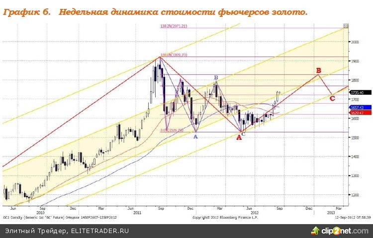 В настоящий момент формируется волна роста «В» в рамках «плоской коррекции» А-В-С. Коррекции предшествовала без малого трехлетняя фаза роста. Вполне логично, что период компенсации роста предположительно будет длиться порядка полутора лет и, по нашим расчетам, завершится в первом квартале 2013 года, после чего начнет формироваться следующая волна подъема котировок. Текущая волна «В» в рамках коррекционного движения направлена вверх, целью, по нашим прикидкам, служит отметка $1830. После чего может последовать волна «С» - цель $1720; на этом «плоская коррекция», по нашему мнению, будет реализована, далее стартует фаза роста