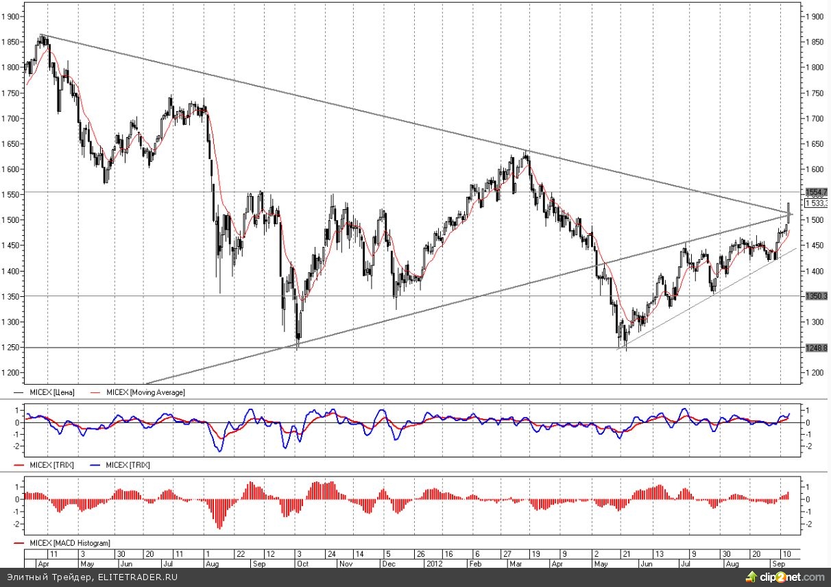 На новой волне роста ММВБ благодаря новым стимулирующим мерам от ФРС добрался как раз до линии сопротивления долгосрочного нисходящего тренда с весны 2011 года на 1515. Более того, этим рывком вверх индекс снова к пробитому ранее долгосрочному восходящему тренду с 2009 года. Ранее в начале июля он уже был протестирован и от него индекс откатывался назад. Сопротивления очень сильные, но позитив на мировых рынков подталкивает игроков к новым покупкам. При закреплении и окончательном пробитии этих сопротивлений на 1515 следующими целями будут уровни уже на 1550.