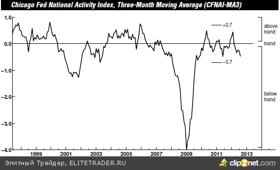 Статистика, обнародованная в понедельник региональными ФРБ, в меньшей степени интересовала участников рынка, что вполне понятно. В условиях уже объявленного QE, среди подобных статданных уже нет смысла отыскивать намеки на действия регулятора. ФРБ Чикаго сообщил о снижении индекса национальной деловой активности (CFNAI) до -0,87 в августе с -0,12 в июле. Более последовательный показатель отражающий риск наступления рецессии CFNAI-MA3 в августе снизился до -0,47 - минимумов с июня 2011 года, вместе с тем являясь минимальным значением с августа 2009 года, когда индикатор был ниже критичных для определения рецессии -0,7 пункта.